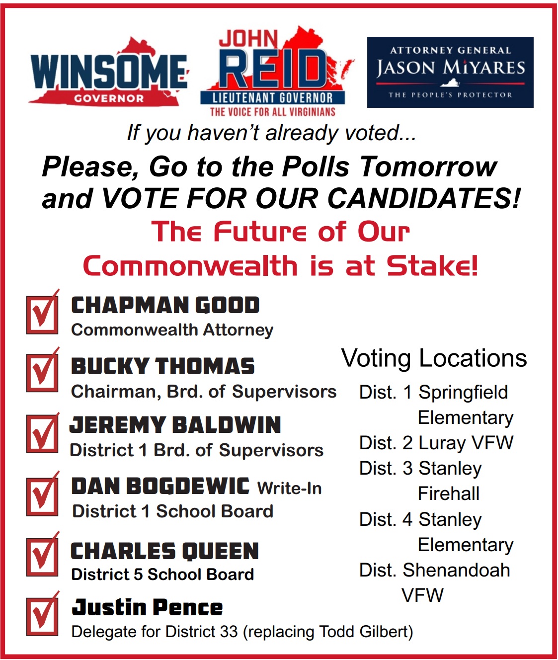 I encourage all to review the attached YouTube videos of the debates between the candidates. Dan and Charlie have the best interest of Page County’s children at heart and will pursue the strong Christian moral and Patriotic values enjoyed by our county.