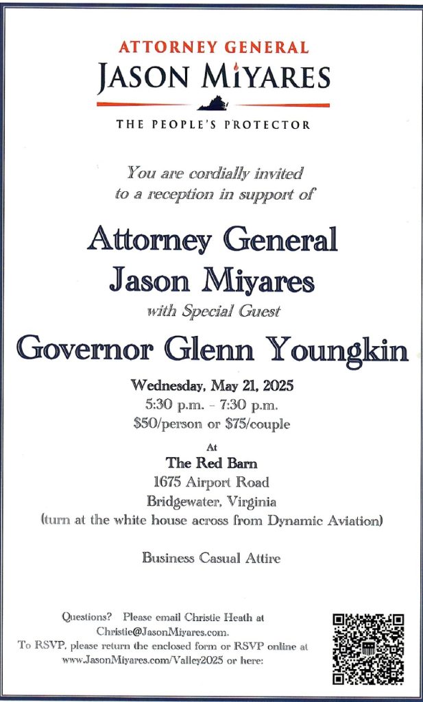 Greetings. Please find below an open invitation to a fund raiser from our current Attorney General and our Republican Candidate who with our help will remain in office and be our next Attorney General. Please consider attending, or a at minimum, donating to this worthwhile cause. We want to provide Attorney General Miyares the opportunity to continue his great work for the Commonwealth of Virginia.